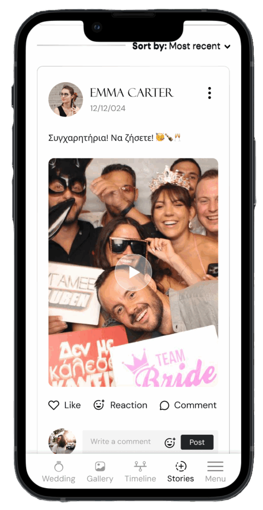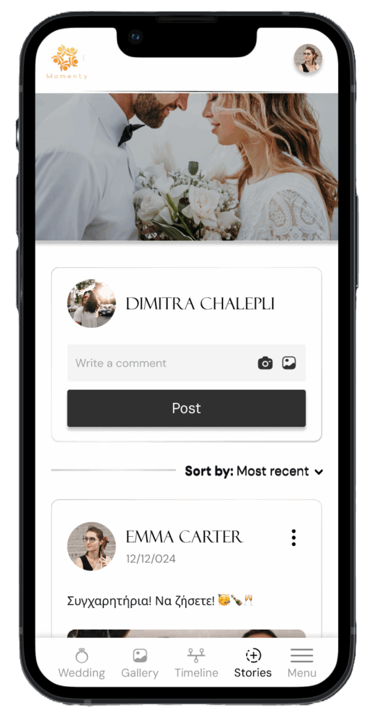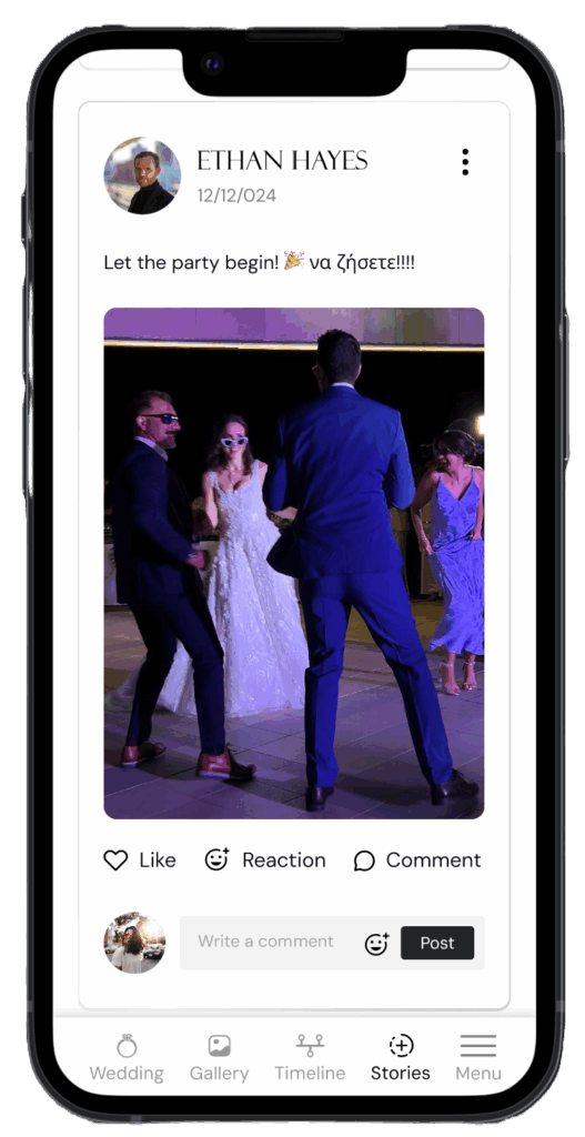 Invite your guests to be part of your story! With our app, they can post heartfelt wishes, share personal stories, and upload photos from your special day — all in one beautiful digital space.